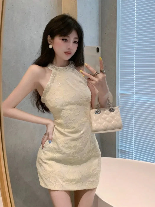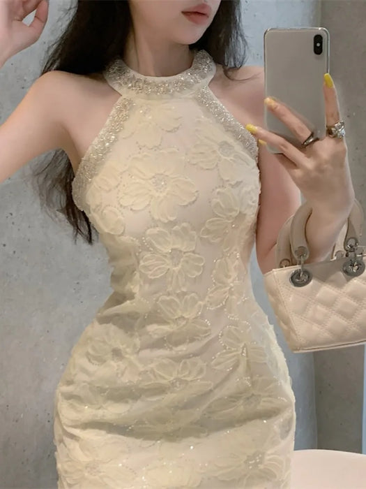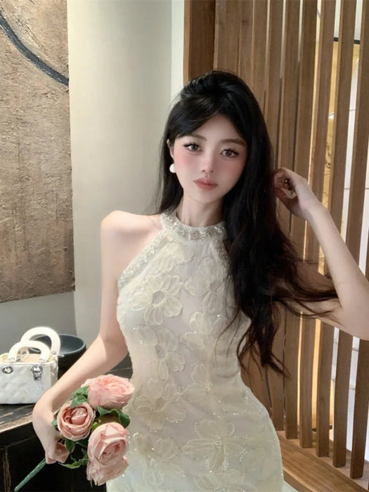 VenusFox Evening Dresses Women Flowers Elegant Mesh Patchwork Sleeveless Rhinestone Hollow Out Wedding Party Cocktail Birthday