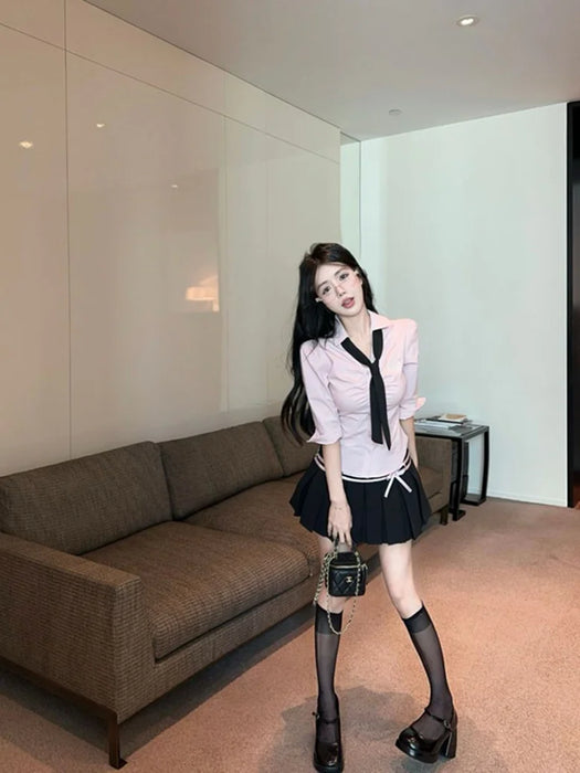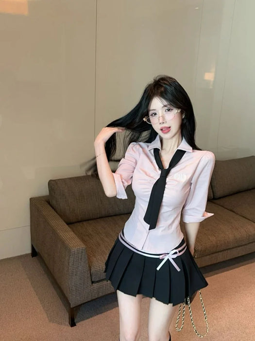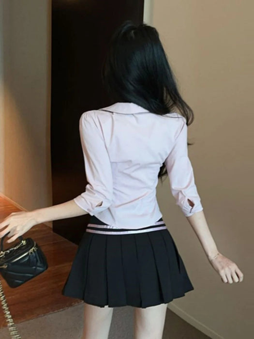 Korean College Sle Sweet And Spicy irt Top with Waist-Cinching Midi Skirt Set Cotton Blend Seven-quarter Sve Tie-waist